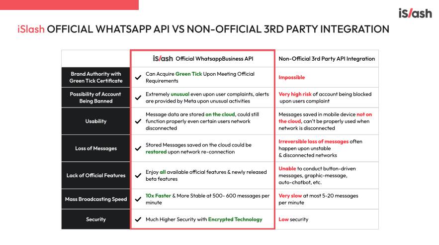 iSlash is an [official WhatsApp API Solution Provider](https://www.facebook.com/business/partner-directory/search?solution_type=messaging\&id=5627944140577026\&section=overview), which means we have been certified by WhatsApp for our expertise in providing business messaging solutions.