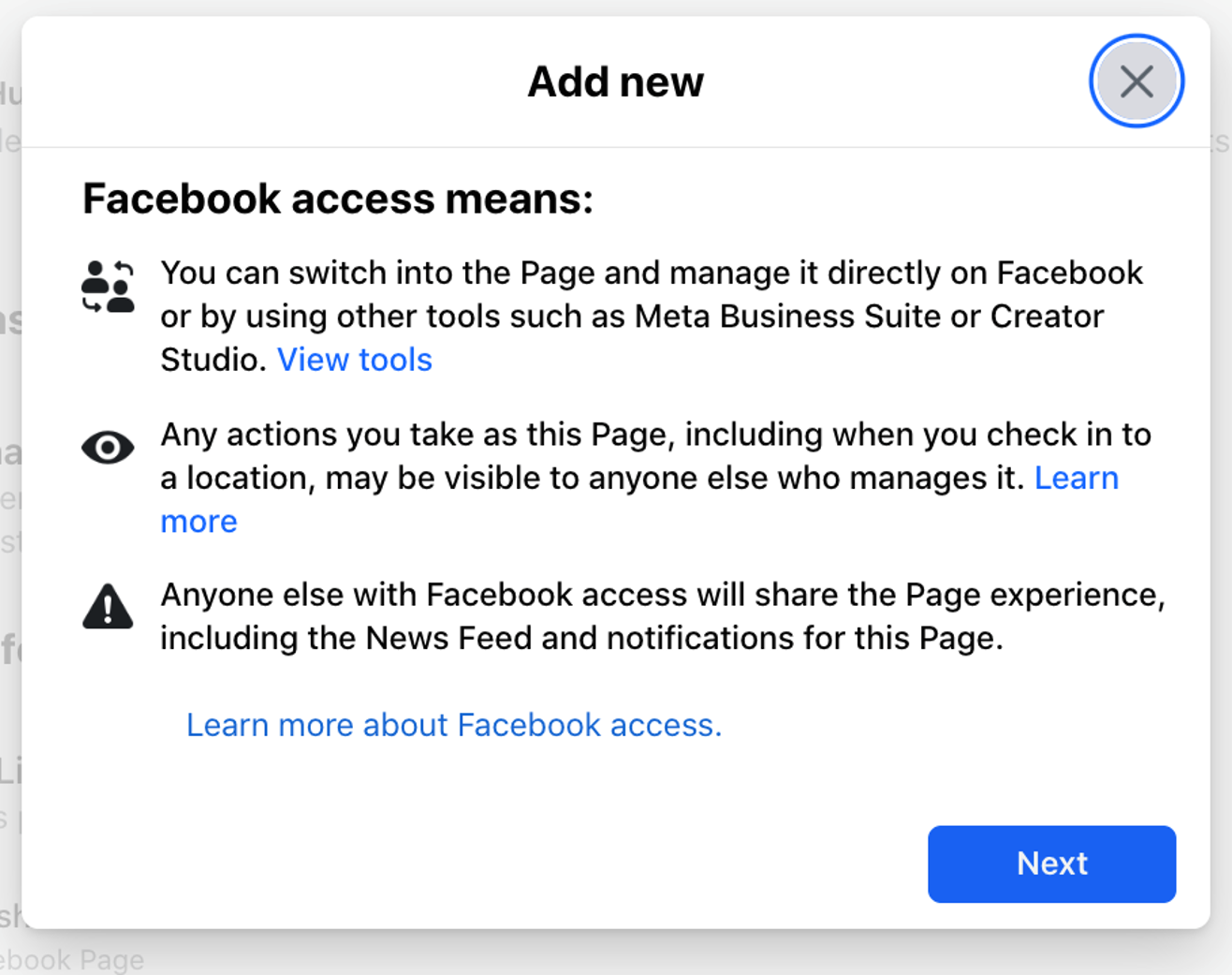 In the [new Pages experience on Facebook](https://www.facebook.com/business/help/582754542592549?id=418112142508425), you can give someone Facebook access with full control or partial control on behalf of your business. People with Facebook access with full control and partial control can manage the following: