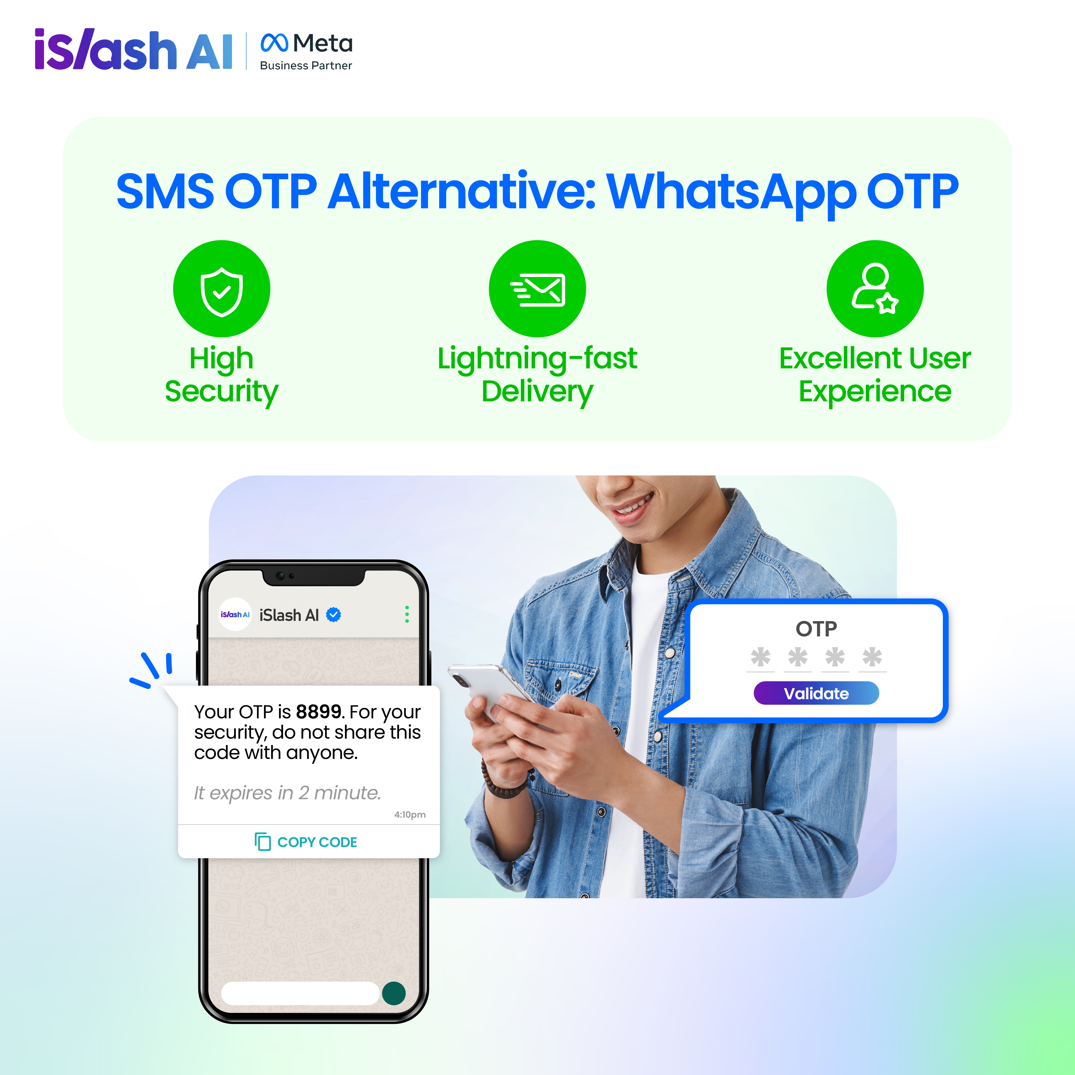 It’s time to let traditional OTP methods rest. <mark style="color:green;">**WhatsApp**</mark>**&#x20;OTP**, available only through the WhatsApp Business API and powered by iSlash AI, delivers security with speed and style.