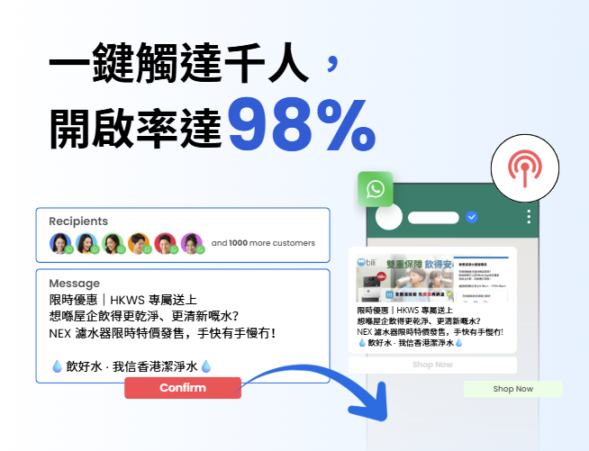 實際數據顯示，HKWS 的廣播訊息平均開啟率高達 **98%**，不僅有效拉近與客戶的距離，也大幅提高了回覆率與轉化率，為我們的業務打造專屬的高轉化私域通訊策略。